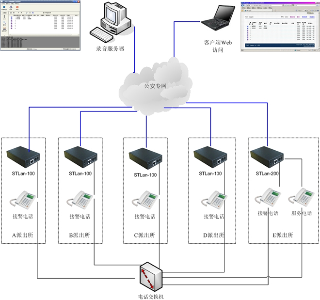 每一个派出所都可以联入公安专网,我们在派出所放一台STLAN网络型数字录设备,STLAN网络型数字录音设备有网络接口,用一个普通网线将其接入公安局域网。(在将STLAN分发之前,先通过配套软件对每一台设备进行相关配置,比如分配一个固定的IP地址等等。)