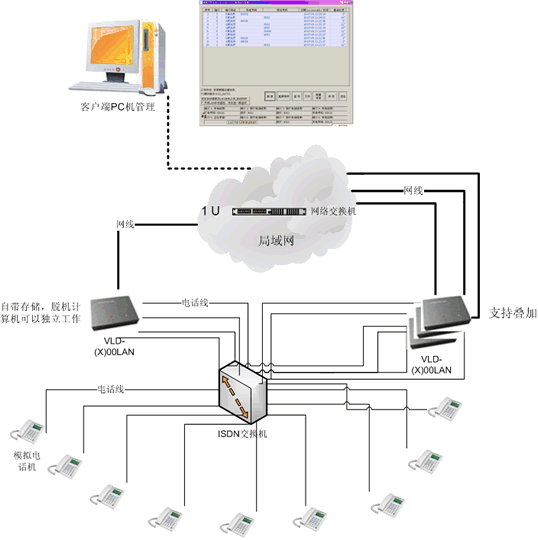 通过USB线缆对每一台设备进行相关的配置,将VLD-xLAN接入局域网,为每一台设备分配一个固定的IP地址,从电话线路上截取信号,便可实时记录通话内容。在局域网中选择任意计算机作为客户端通过网络对VLD-xLAN录音设备数据进行访问、实时监听。