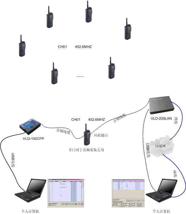 如图所示,以一个频点为一个单位(不计对讲机的数量),同一个频点内的对讲机可以相互对话,在每一个频点里增加一台对讲机,将其频点和信道设置成需要录音的频点,与录音设备放置一处。从这台对讲机的耳机接口输出信号,拉一根线与VLD录音设备的音频输入口对接(连接不同的音频接口需要手工焊接),此台对讲机便可将接收到的模拟信号音传输给录音设备。注意,此台对讲机只作为录音之用,不再用来发射。