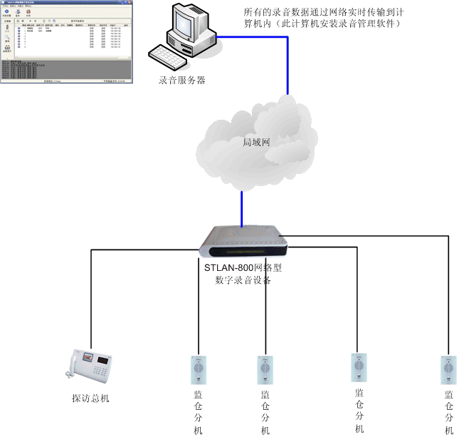 如果探访对讲和监仓对讲设备有摘机和挂机功能,我们通过标准的压控方式对它们进行录音,录音的方式与对电话线路录音一眼。如果没有摘机和挂机功能,我们可以以声控的方式录音,采用并线的方式获取音频信号送给STLAN录音设备。录音设备将模拟信号音转成数字信号,实时通过网络传至录音服务器,进行永久保存,可以随时查询调用。通过服务器端软件,可以实现实时监听。局域网中的任意计算机都可以通过web浏览器查询数据,客户端不需要安装任何软件。
