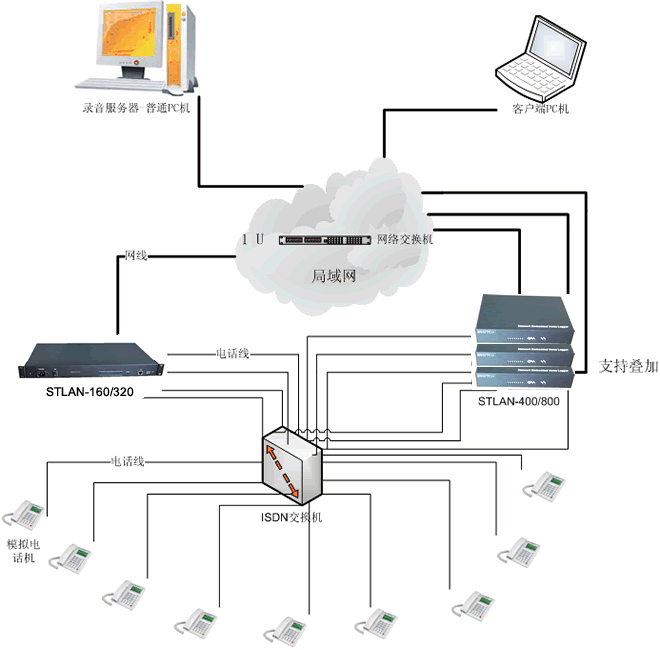 录音存储服务器与STLAN硬件通过标准TCP/IP协议网络相连,因此不受限于服务器存放位置,录音设备可以放在任何有网络接口的地方。